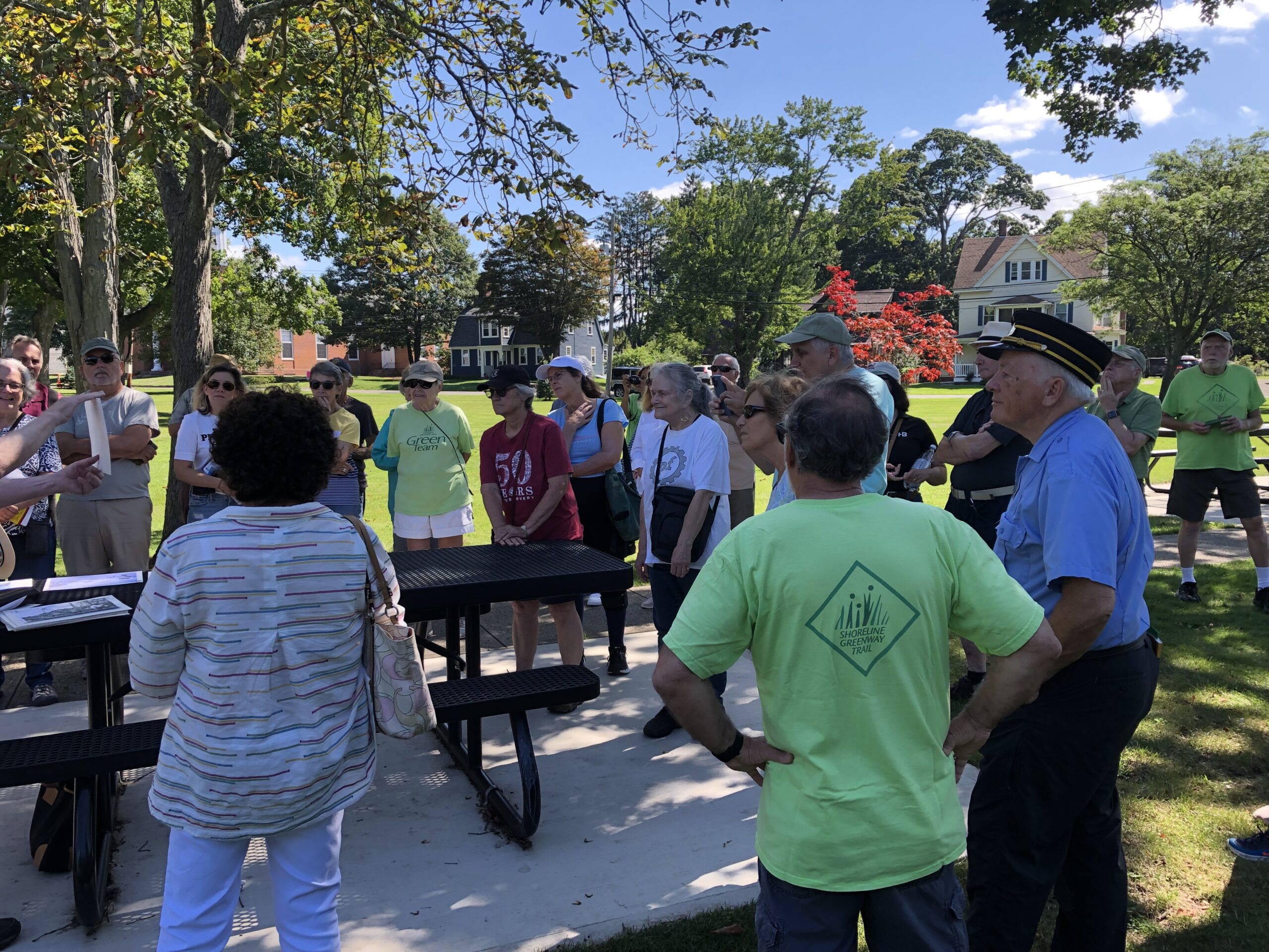 We took a walk up to the green to enjoy the cool breeze and hear the wisdom of David Campbell from the East Haven Historical Society. Mr. Campbell brought a photo collection from the trolley museum that he discussed in detail while we stood on the green where over 100 years ago the trolley lines could have been seen moving toward the beach, New Haven, and Lake Saltonstall. Amazing to think trolleys were present here for 53 years!