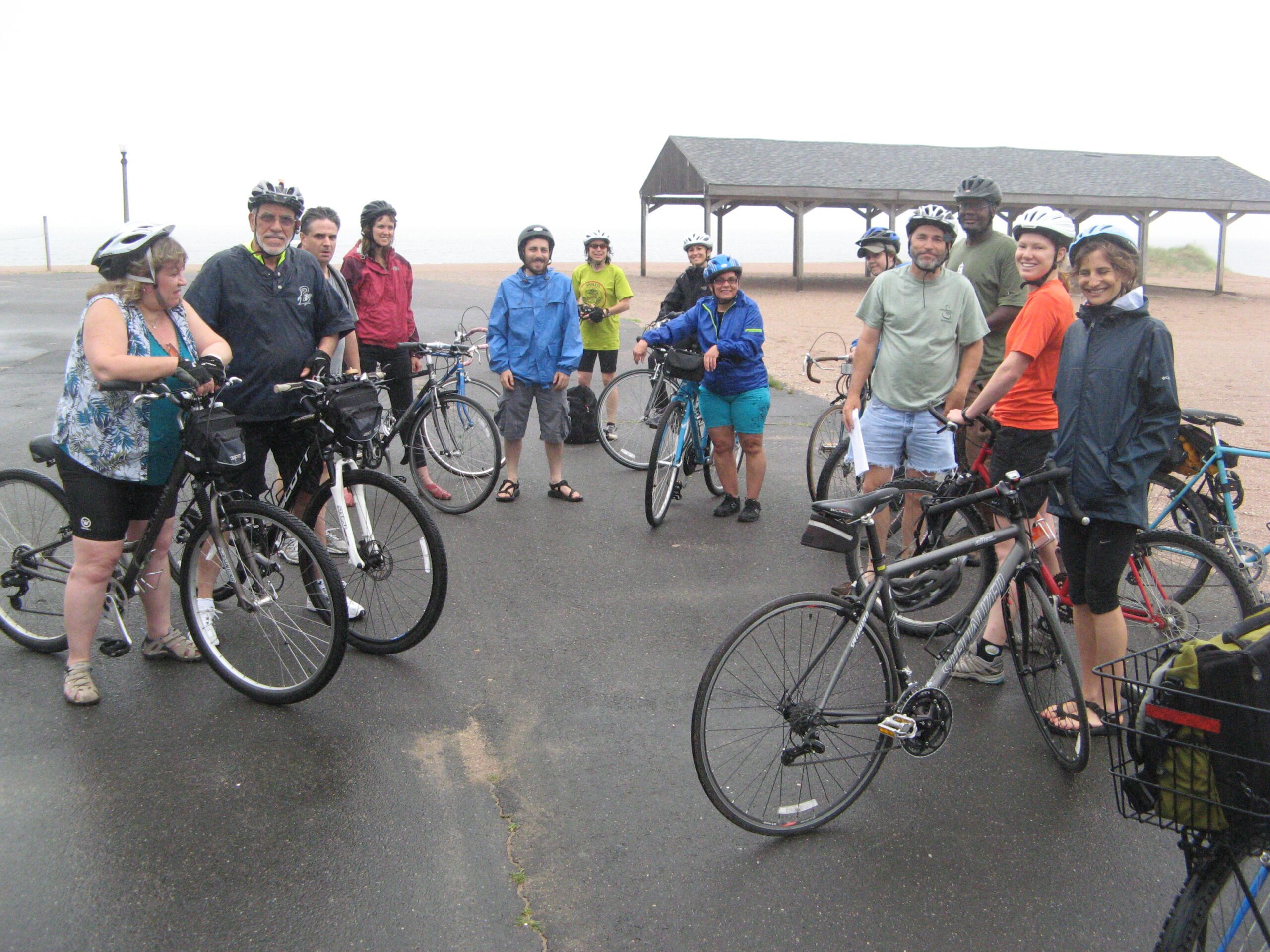 Rain did not dampen all bikers’ enthusiasm to ride from New Haven Green to Lighthouse Point and Shoreline Greenway Trail in East Haven with Leader Paul Proulx as part of the New Haven Arts& Ideas Festival in June.Elm City Bike tour at Lighthouse Point