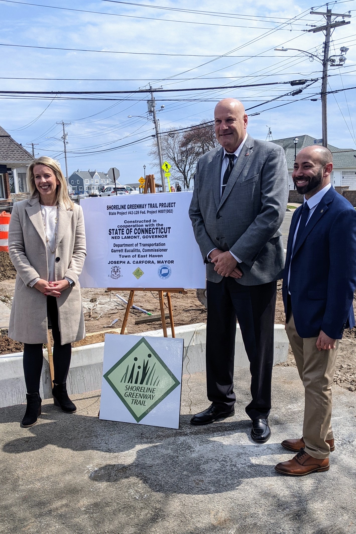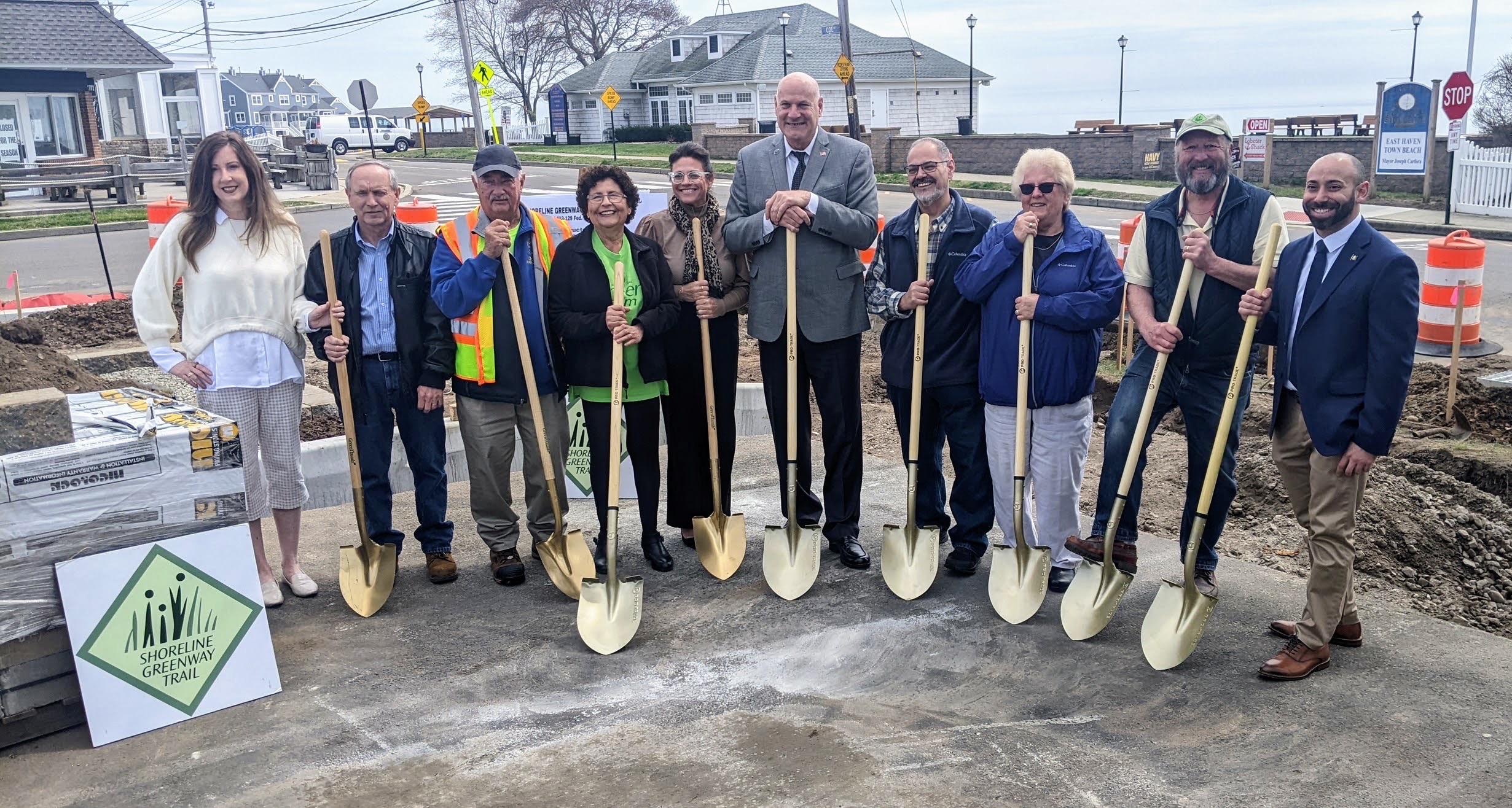 On Thursday, April 6 a groundbreaking ceremony was held to celebrate the start of needed work to extend SGT approximately two miles from the existing trail off Elliot Street (former site of (DCMoore School). This event was attended by both local and state elected officials, the town Economic Director, Superintendent of Operations for Public works, and many Shoreline Greenway Trail members and supporters.